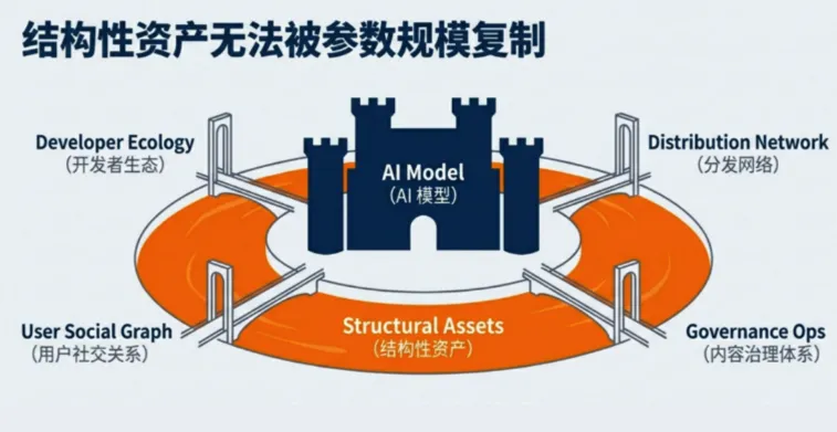 而在这场竞赛中,真正决定胜负的,不是某一次模型发布,而是平台长期积累的结构性资产:开发者生态、分发网络、用户关系,以及围绕内容治理和变现形成的运营体系。这些东西,无法靠参数规模快速复制。