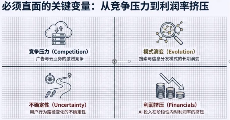 当然,高盛并未回避风险。报告中同样列出了可能影响判断的关键变量,包括广告与云业务的竞争压力、搜索与信息分发模式的长期演变、用户行为路径变化的不确定性,以及 AI 投入在阶段性内对利润率的挤压。在所有变量之上,监管始终是悬在大型科技公司头上的结构性约束。