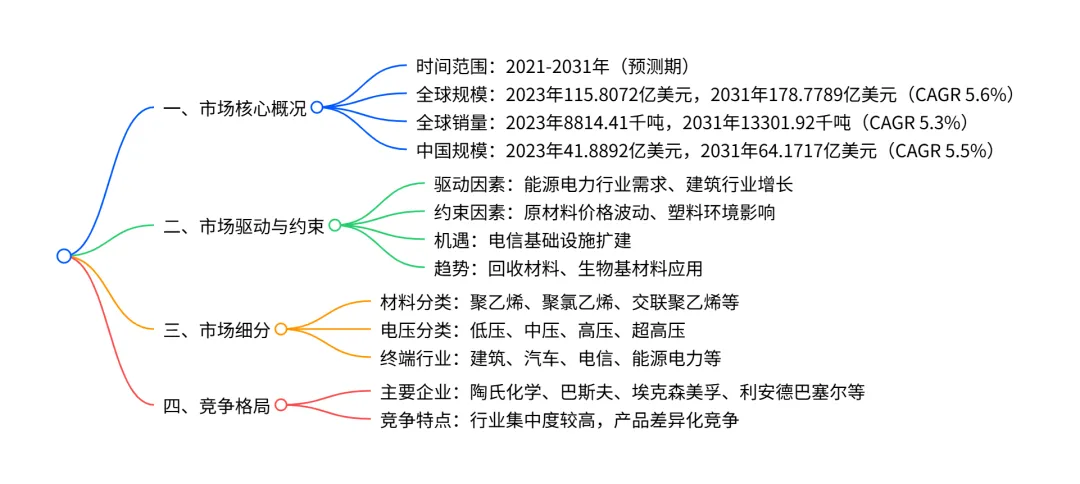 全球及中国电线电缆塑料市场在 2023-2031 年将保持稳健增长,2023 年市场规模为 115.8072 亿美元,预计 2031 年达 178.7789 亿美元,CAGR 为 5.6%;核心驱动因素包括能源电力行业需求增长、建筑行业扩张,主要制约因素为原材料价格波动及塑料使用的环境影响,关键机遇来自电信基础设施扩建,未来趋势聚焦回收和生物基材料;市场按材料可分为聚乙烯、聚氯乙烯、交联聚乙烯等,其中交联聚乙烯占比最高且增速最快(CAGR 6.2%),按电压以低压产品为主(2023 年占比 42.6%),按终端行业以建筑行业为核心(2023 年占比 31.9%);中国市场 2023 年规模 41.8892 亿美元,预计 2031 年达 64.1717 亿美元(CAGR 5.5%),主要参与者包括陶氏化学、巴斯夫、埃克森美孚等。