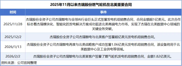 2月1日,杰瑞股份公告,公司海外全资子公司杰瑞敏电与北美某客户签署了燃气轮机发电机组销售合同,合同金额为1.82亿美元。