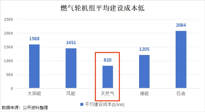 从建设成本看,燃气轮机组由于技术成熟、占地面积小,其初始投资远低于其他能源。