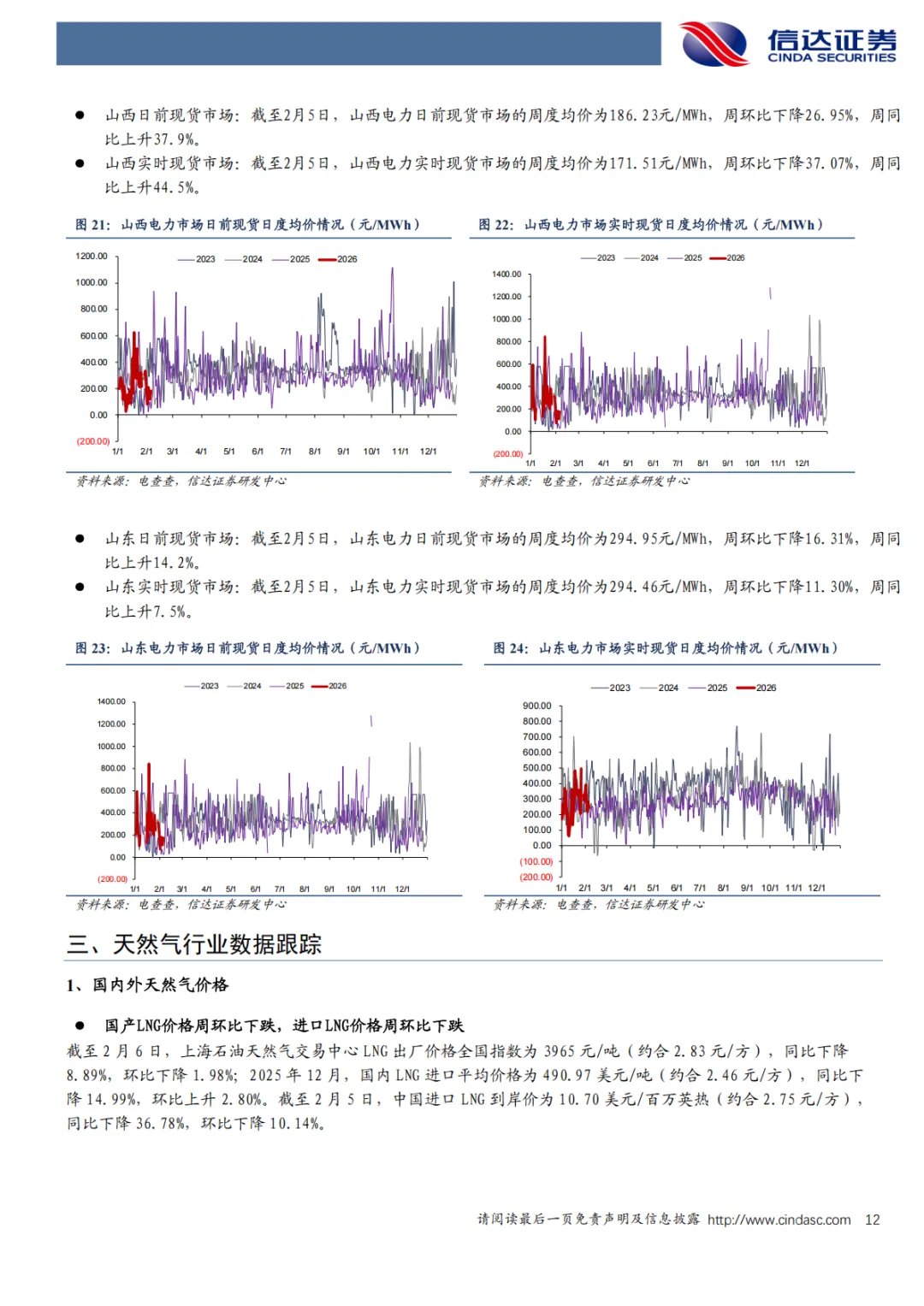 进口价格:2025年12月,国内LNG进口平均价格为490.97美元/吨(约合2.46元/方),同比下降14.99%,环比上升2.80%;截至2月5日,中国进口LNG到岸价为10.70美元/百万英热(约合2.75元/方),同比下降36.78%,环比下降10.14%。