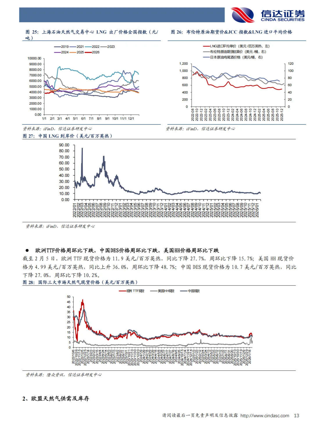 国内价格:截至2026年2月6日,上海石油天然气交易中心LNG出厂价格全国指数为3965元/吨(约合2.83元/方),同比下降8.89%,环比下降1.98%。
