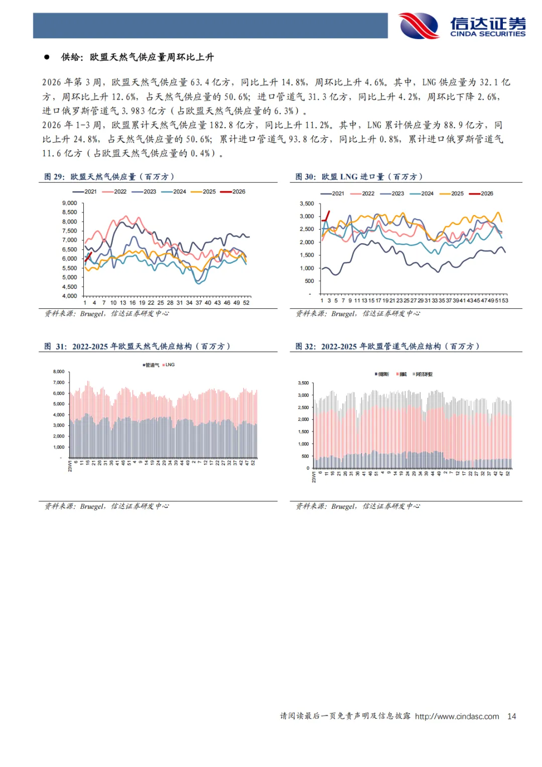 供应端:2026年第3周,欧盟天然气供应量63.4亿方,同比上升14.8%,周环比上升4.6%;其中LNG供应量32.1亿方(占比50.6%),周环比上升12.6%。