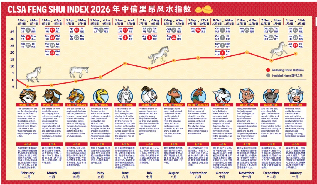 研报强调“2026年将告别蛇年的犹豫试探,马年以自信之姿,携万钧之势奔腾而至”。从中信里昂给出的风水指数图来看,恒生指数马年走势节奏鲜明:2月触底后一路走高至6月,7月迎来回调,后续小幅震荡上行至11月,12月显著下挫,直至2027年1月迎来强势反弹。其中3月至6月,恒生指数将迎来一波较大的上涨行情。