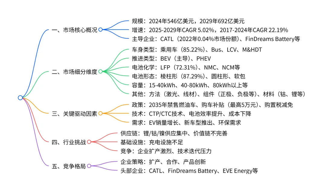 中国 EV 电池组市场在 2024 年规模达546 亿美元,预计 2029 年将增长至692 亿美元,2025-2029 年 CAGR 为5.02%;市场以乘用车(85.22% 价值份额)、BEV(主导推进类型)、LFP 电池(72.31% 价值份额)和棱柱形电池(87.29% 价值份额)为核心细分领域,CATL 是领先市场参与者,政府补贴、技术进步(如 CTP/CTC 技术)和电池价格下降(2010-2020 年锂 - ion 电池成本降 88%)为主要增长驱动力,同时面临原材料供应链集中、充电基础设施不足等挑战,行业竞争激烈且企业多通过扩产、合作与创新强化布局。