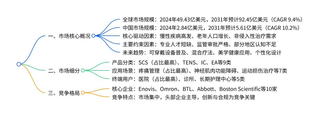 全球及中国电疗系统市场在 2024 年规模达49.43亿美元,预计2031年将增至92.45亿美元,年复合增长率9.4%,其中中国市场增速更快(CAGR 10.2%);市场以脊髓电刺激(SCS) 为核心产品(2024 年占比 36.8%),疼痛管理为主要应用场景(2024 年占比 40.7%),医院是最大终端用户(2024 年占比 43.6%);增长驱动力包括慢性疼痛与肌肉骨骼疾病高发、老年人口增加、非侵入性无药物治疗需求上升,同时面临专业人才短缺、监管审批严格等约束,未来趋势聚焦可穿戴设备、混合疗法系统及美学健康领域应用,Enovis、Omron、Medtronic 等为核心竞争企业。