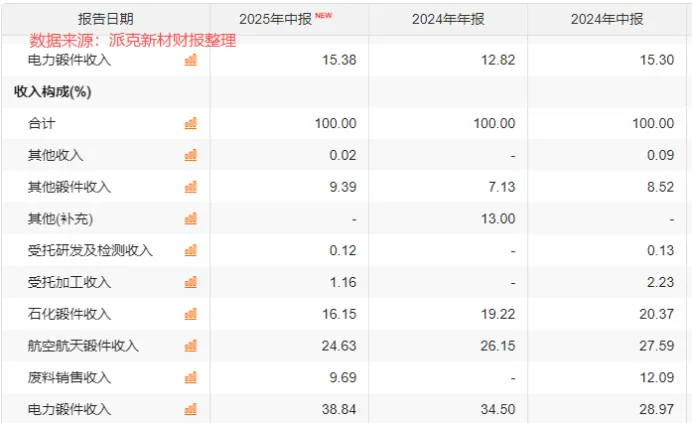 公司专注锻件业务,产品涵盖了多个领域,而从公司的营收结构看,2025年上半年,电力锻件业务收入占比提高到了38.84%,航空航天锻件业务占比为24.63%。