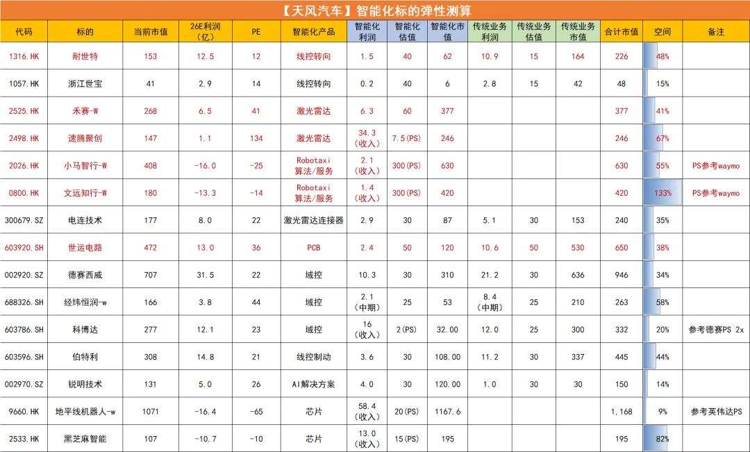 【耐世特】:4月Cybercab开始量产,FSD算法成熟后有望快速上量,公司独供线控转向。同时理想L9、小鹏G01等国产线控转向车型陆续落地,验证产业趋势,线控转向渗透率有望快速提升。给线控1.5e利润40x+EPS11e利润15x,目标市值226e,50%空间。