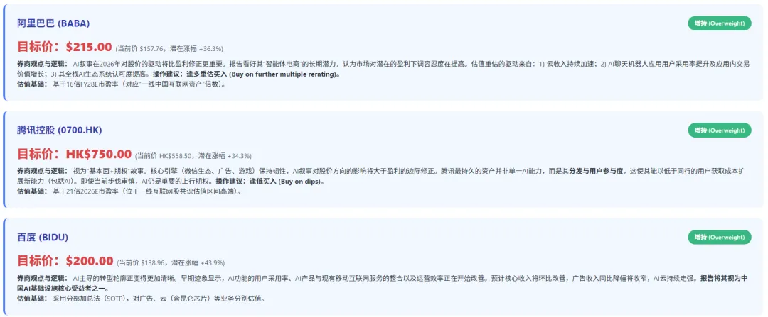 阿里巴巴:建议逢低买入,目标价215美元。AI叙事在2026年推动股价比盈利修正更重要,对阿里巴巴在代理商务长期潜力的积极投资者情绪增加对潜在负面盈利修正的容忍度。腾讯:建议逢低买入,目标价750港元。将腾讯视为2026年的“基本面加期权”故事:核心引擎保持韧性,预计AI叙事对股价方向的影响大于增量盈利修正。百度:建议增持,目标价200美元。AI主导转型的轮廓正变得更加清晰,早期迹象表明AI功能的用户采用、AI产品集成到现有移动互联网服务以及运营效率开始改善。风险提示