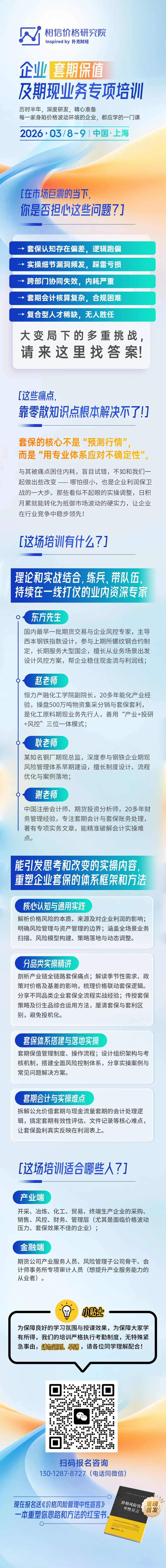 同时我们深知,中小企业在严格执行套保策略时,面临成本控制与可操作性的现实难题,因此课程在坚守专业底线的前提下,更注重适配中小微企业需求,提供风险可控、落地可行的操作方案,助力企业在价格风险管理之路上稳中前行,逐步建立贴合自身规模的套保制度。