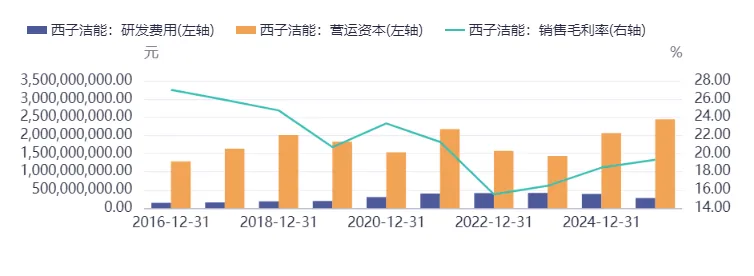 期间费用控制有效,盈利能力逐步改善。2024年,西子洁能的销售费用为88百万元,管理费用为3.53亿元,财务费用同比增长340.17%。2025年,公司继续优化期间费用管理,销售费用下降至84百万元,期间费率为5%。尽管财务费用有所增加,但整体期间费用率的下降表明公司在成本控制方面的努力取得了一定成效。未来,公司需要继续关注期间费用的控制,以确保盈利能力的持续提升。