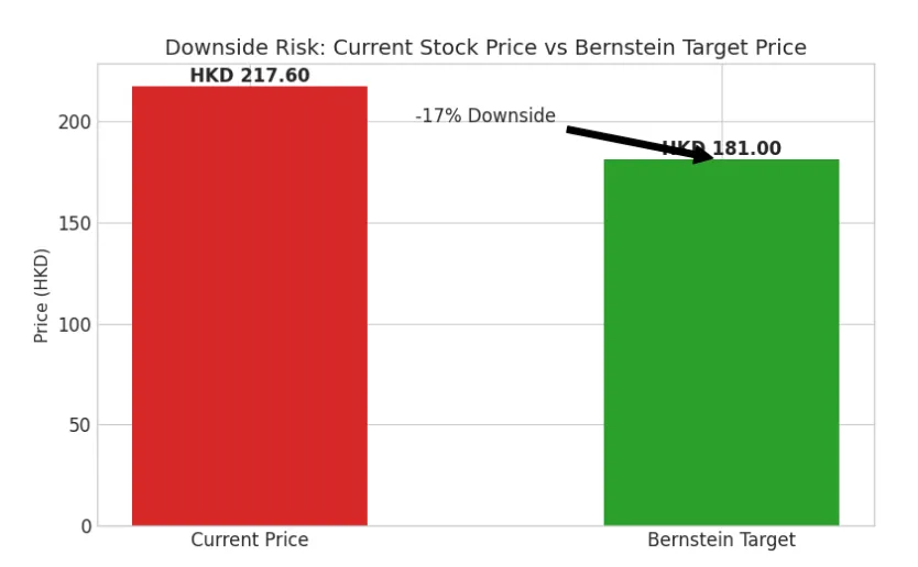 评级:跑输大市 (Underperform)。目标价:181.00 港元(原目标价 225 港元)。潜在跌幅:-17%