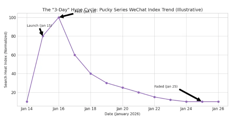 PUCKY(毕奇) "Tap Tap Babies" 系列:1月15日发布,微信指数在16日达到峰值,然后迅速回落。更惨的是,发布才2-3周,二级市场(闲鱼等)上近一半的 SKU 已经跌破发行价(打折出售)