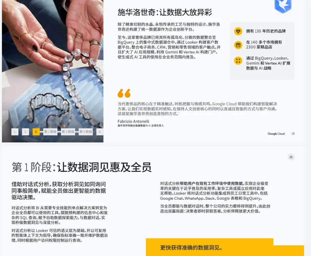研报中图4(对话式分析重塑行业新格局) 清晰呈现了这一模式的价值跃迁:对话式分析让BI从少数技术专家掌握的静态面板,变成全员可交互的战略资源,更让数据分析从企业的成本中心,直接升级为收入增长引擎。施华洛世奇整合全渠道数据至BigQuery,通过Looker实现全业务AI普及;香港Game Bear借助Looker让员工自主查数据,实现近实时数据分析,这些真实案例印证了对话式分析的落地价值。