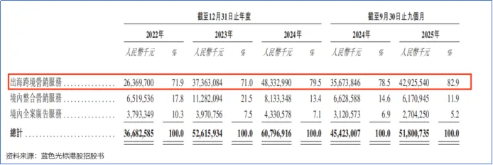 2025年前三季度,公司来自出海跨境营销服务的收入达到429.26亿元,占比达82.9%。