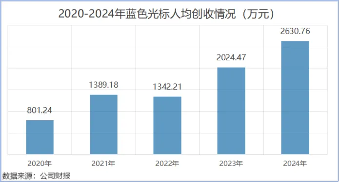 财报数据显示,公司员工人数从2020年的5058人锐减至2024年的2311人,缩减幅度超过一半。同期,公司人均创收从801.24万元增至2630.76万元。