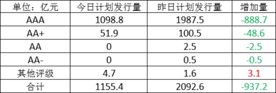 今日存单计划发行量规模1155.4亿元,较上一工作日计划发行量大幅减少,减少了937.2亿元。