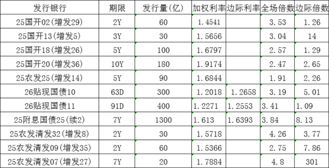 今日农业发展银行发行2年政策性金融债,发行量30亿元,发行利率1.5718%,投标倍数4.26倍,边际倍数3.77倍;农业发展银行发行2年政策性金融债,发行量60亿元,发行利率1.5366%,投标倍数2.75倍,边际倍数7.86倍;农业发展银行发行7年政策性金融债,发行量20亿元,发行利率1.7884%,投标倍数4.8倍,边际倍数301倍。
