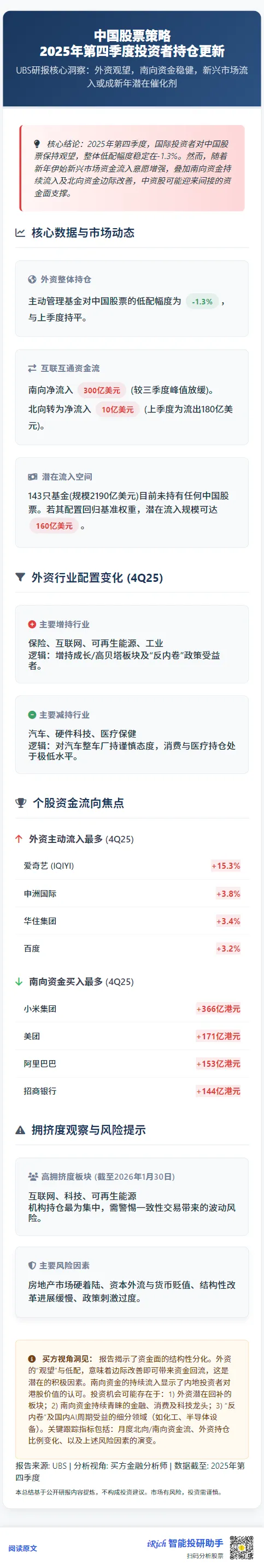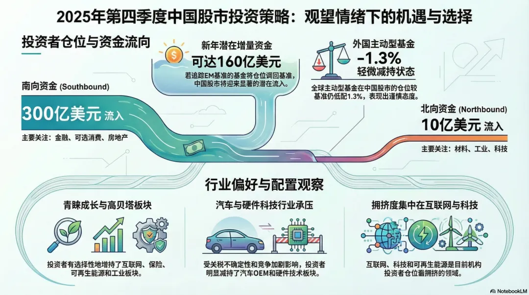瑞银中国股票策略研报深度解析:外资驻足观望,市场静待破局信号2025年四季度中国股票市场呈现明显的观望态势,外资机构配置比例保持稳定,低配幅度维持在-1.3%水平。亚洲区域基金小幅增持中国股票,而新兴市场和全球配置基金则维持原有低配比例。南北向资金流动出现显著变化,市场在关税不确定性、消费增长放缓等宏观因素影响下进入等待模式。关键数据透视:跟踪约800只主动管理型外资基金合计持有2660亿美元中国股票,其中143只基金(规模2190亿美元)完全未配置中国资产。若这些基金按基准权重配置,潜在流入规模可达160亿美元。资金流向深度剖析