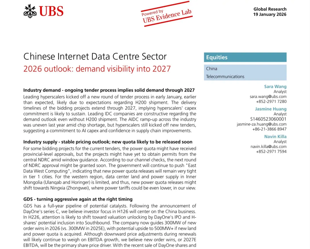 瑞银证券亚洲有限公司2026年1月19日发布《中国互联网数据中心行业2026展望:需求可见性延伸至2027年》研报,明确指出国内IDC行业需求端具备强确定性,供应端政策导向清晰,头部企业GDS、VNET凭借资源与交付优势,将充分承接行业红利,2027年EBITDA增长具备高可信度。、