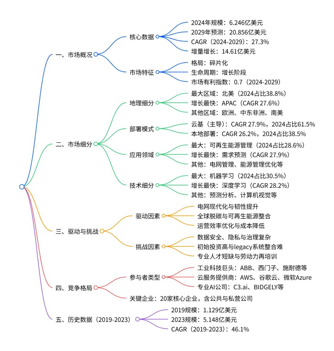 2024-2029 年全球能源和公用事业领域应用 AI 市场呈现强劲增长态势,2024 年市场规模达6.246 亿美元,预计 2029 年将增至20.856 亿美元,期间复合年增长率(CAGR)为27.3%,增量增长达14.61 亿美元;市场以碎片化格局为主,北美是最大区域市场(2024 年占比 38.8%),APAC为增长最快区域(CAGR 27.6%);部署模式上云基占主导且增长最快(CAGR 27.9%),应用领域以可再生能源管理(2024 年占比 28.6%)和需求预测(CAGR 27.9%)为核心,技术层面机器学习是最大细分领域(2024 年占比 30.5%),深度学习增长最快(CAGR 28.2%);市场驱动因素包括电网现代化、脱碳目标和运营效率提升,同时面临数据安全、初始投资高及专业人才短缺等挑战,竞争格局涵盖工业科技巨头、云服务提供商和专业 AI 公司。