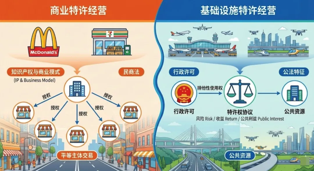 我们需要严格区分“基础设施特许经营”与“商业特许经营”。商业特许经营(Business Franchising),如麦当劳或便利店模式,核心在于知识产权与商业模式的授权,遵循民商法逻辑,体现的是平等主体间的交易关系2。而基础设施特许经营(Infrastructure Concession),则带有鲜明的行政许可属性与公法特征。它涉及公共资源的排他性使用权(如机场的起降时刻、低空的空域资源),其核心在于“特许权协议”中对风险、收益与公共利益的精细平衡1。