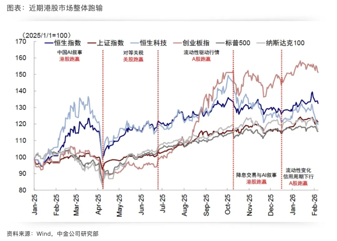 行情切换逻辑根植于基本面、流动性、特色结构三个维度。当流动性收紧、特色结构不受关注或基本面偏弱时,港股往往跑输,反之跑赢。2月以来,港股尤其是恒生科技大跌,也正源自这三方面的变化。