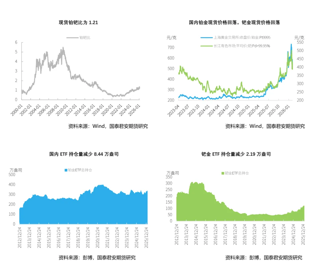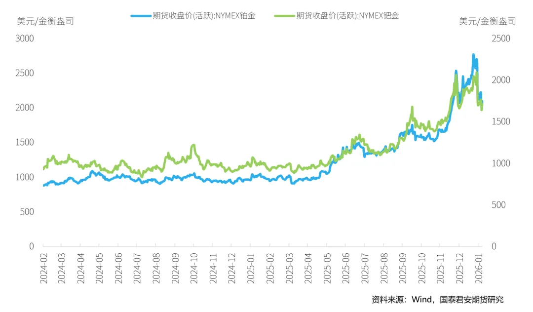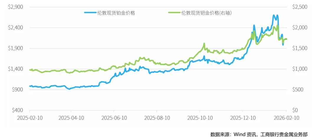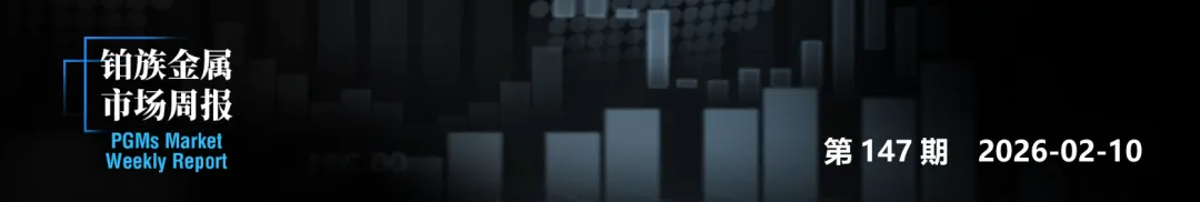 本周, 铂金期货价格继续下跌,截至2026年2月6日,NYMEX铂金期货价格收盘价为2097.4美元/盎司,周累计下跌3.71%。钯金方面,本周NYMEX钯金期货则有所回升,周五收盘价为1712美元/盎司,周上涨0.65%。