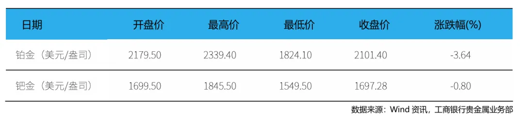本周(2月2日 – 2月8日,下同),现货铂金开盘价为2179.5美元/盎司,最高价为2339.4美元/盎司,最低价为1824.1美元/盎司,收盘价为2101.4美元/盎司,周累计下跌3.64%。现货钯金开盘价为1699.5美元/盎司,最高价为1845.5美元/盎司,最低价为1549.5美元/盎司,收盘价为1697.28美元/盎司,周累计下跌0.8%。