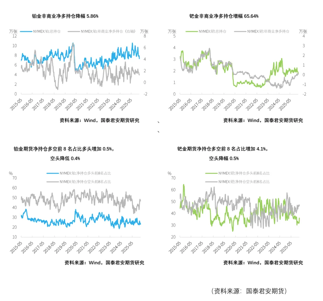 截至2026年2月3日,铂金总持仓较上周减少5851张,其中非商业多头方面减少4951张,非商业空头持仓较上周减少4135张,降幅18.38%。因此,非商业净多头持仓减少816张,降幅5.86%。钯金方面,总持仓减少1819张,降幅9.51%,其中非商业多头持仓减少918张,降幅9.73%,空头减少1367张,降幅15.62%,因而非商业净多持仓增加449张,增幅65.64%。在净持仓多空前8名占比上,本周铂金方面净持仓多头占比增加0.5%,空头占比降低0.4%,钯金方面多头占比增加4.1%,空头占比降幅0.5%。