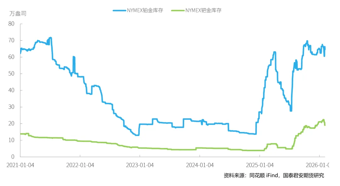 截至2026年2月6日,当周NYMEX铂金库存去库0.87万盎司,钯金期货库存去库。在现货升贴水方面,本周铂金升贴水波动率较大,以周五收盘价来看贴水43.4美元/盎司。钯金同样波动,周五贴水19美元/盎司。ETF持仓量情况,铂金持仓量回落,其全球ETF持仓量本周减少8.44万盎司,钯金持仓量回落,ETF持仓量本周减少2.19万盎司。