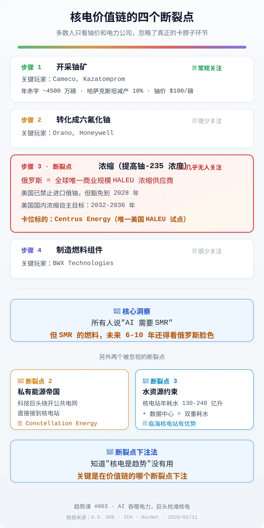 多数人讨论核电投资时,只看步骤 1(铀价)和最终端(已经涨了 8 倍的电力公司)。他们完全忽略了五个更深层的结构性问题。