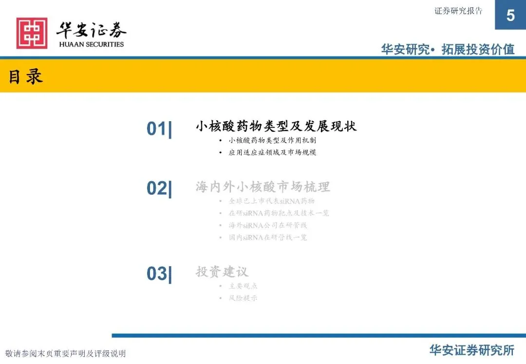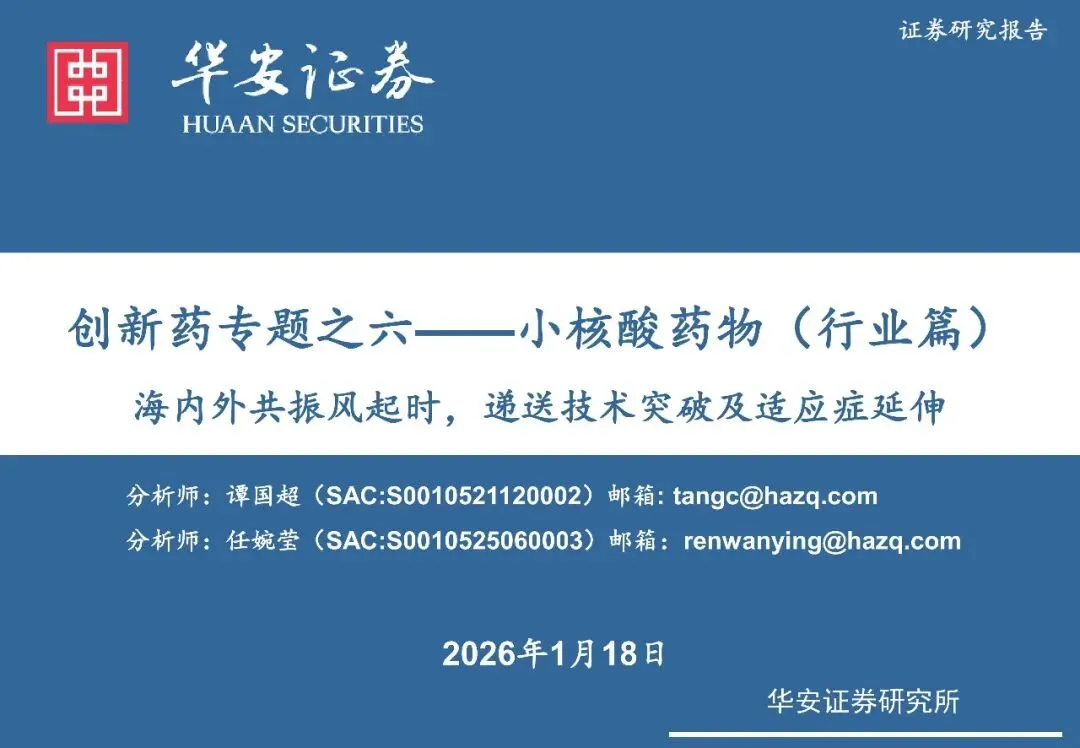 【深药研报】创新药专题之六——小核酸药物(文末可下载)( 来源:华安证券 )一键领取报告感谢关注!很高兴为您分享这份报告。📥 获取完整版指南:请前往公众号对话框,回复关键词「20260211」,即可获取。👉温馨提示:本报告源自公开渠道,仅供内部学习参考,请勿用于商业目的。