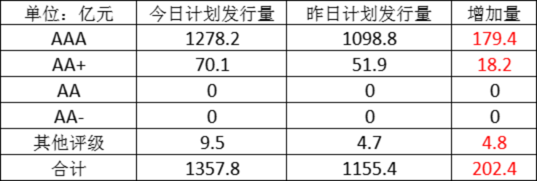 今日存单计划发行量规模1357.8亿元,较上一工作日计划发行量有所增加,增加了202.4亿元。