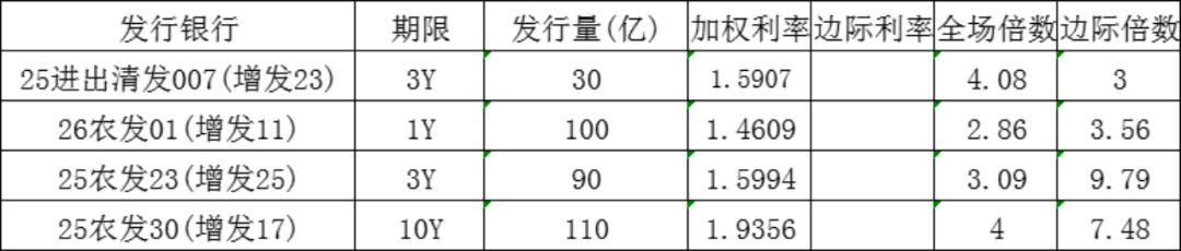 今日农业发展银行发行1年政策性金融债,发行量100亿元,发行利率1.4609%,投标倍数2.86倍,边际倍数3.56倍;农业发展银行发行3年政策性金融债,发行量90亿元,发行利率1.5994%,投标倍数3.09倍,边际倍数9.79倍;农业发展银行发行10年政策性金融债,发行量110亿元,发行利率1.9356%,投标倍数4倍,边际倍数7.48倍。