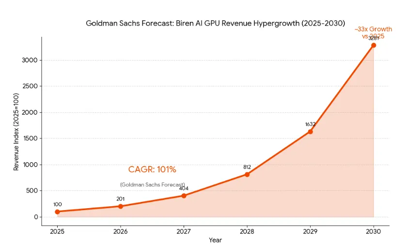 任何一家伟大的公司,都离不开时代的红利。对于壁仞来说,这个红利就是中国云端资本支出(Cloud Capex)的疯狂增长。高盛在报告中指出,驱动壁仞增长的第一大引擎,正是中国云厂商为了适配2024年底涌现的国产大模型,正在疯狂通过基础设施建设来“补课” 。市场份额的掠夺者:凭借极具竞争力的性价比(Price-to-performance ratio)和日益成熟的本地AI生态,壁仞正在自家主场——中国市场,大口吞噬份额全栈护城河:壁仞卖的不仅仅是芯片,而是“芯片+软件”的全栈解决方案(GPGPU硬件 + BIRENSUPA软件平台) 。这对客户来说意味着什么?意味着买了就能用,部署门槛大幅降低高盛预测,得益于这些宏观利好,2025年至2030年,壁仞的AI训练/推理GPU业务收入将实现惊人的101%年复合增长率(CAGR)【图表1:高盛对壁仞的收入预测】02|核武器BR166:从3万到90万的裂变