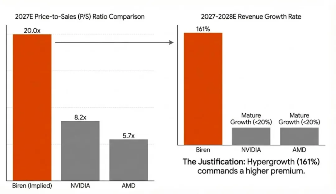 对于硬科技公司,投资者最担心的往往是:“你很牛,但你烧钱要烧到什么时候?”利润拐点:预计壁仞的净利润将在2028年转正,并在2030年达到30亿元人民币现金流转正:自由现金流(FCF)同样将在2028年转正,达到3.37亿元效率飞跃:看看这个运营指标的改善——现金循环周期(CCC)将从2026年的127天,极限压缩到2030年的14天。库存周转天数更是从240天降至60天 。这说明什么?说明货卖得越来越快,钱回得越来越快!【图表3:高盛对于壁仞的估值对比】高盛给出的目标价隐含了2027年20倍的市销率(P/S)。你可能会说,英伟达(NVIDIA)才8.2倍,AMD才5.7倍,壁仞凭什么这么贵?答案就在于增长速度。壁仞2027-2028年的收入增速高达161%,而巨头们显然已经过了这个爆发期。高增长,理应享受高溢价。04|写在最后:该上车了吗?