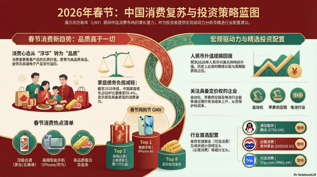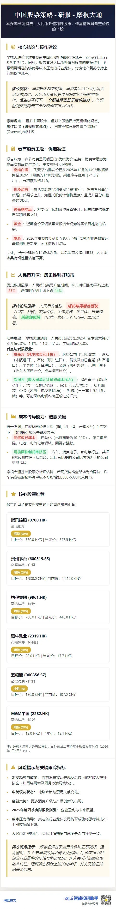 摩根大通研报-深度解析春节消费机遇,人民币升值下的投资策略摩根大通最新发布的2026年2月全球市场策略报告,聚焦中国股票市场,以春节消费、人民币汇率波动和输入成本上升为核心线索,揭示了当前市场的关键机遇与风险。春节消费新趋势:品质升级与实用主义主导