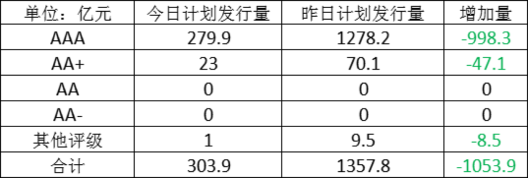 今日存单计划发行量规模303.9亿元,较上一工作日计划发行量大幅减少,减少了1053.9亿元。