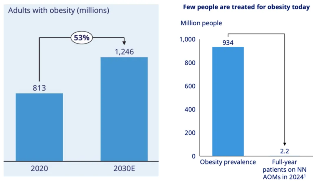 惊人的未开发市场: 根据诺和诺德引用的研究,全球有9.34亿肥胖症患者,且预计到2030年将增至12.45亿,年均增长率高达7% 。