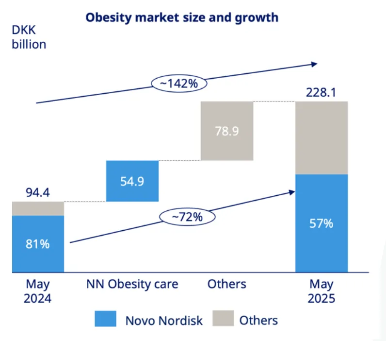 尽管公司股价遭遇挫折,但我们必须承认:这依然是全人类最确定的增长赛道之一。 诺和诺德面临的是一个典型的"两级火箭"市场。