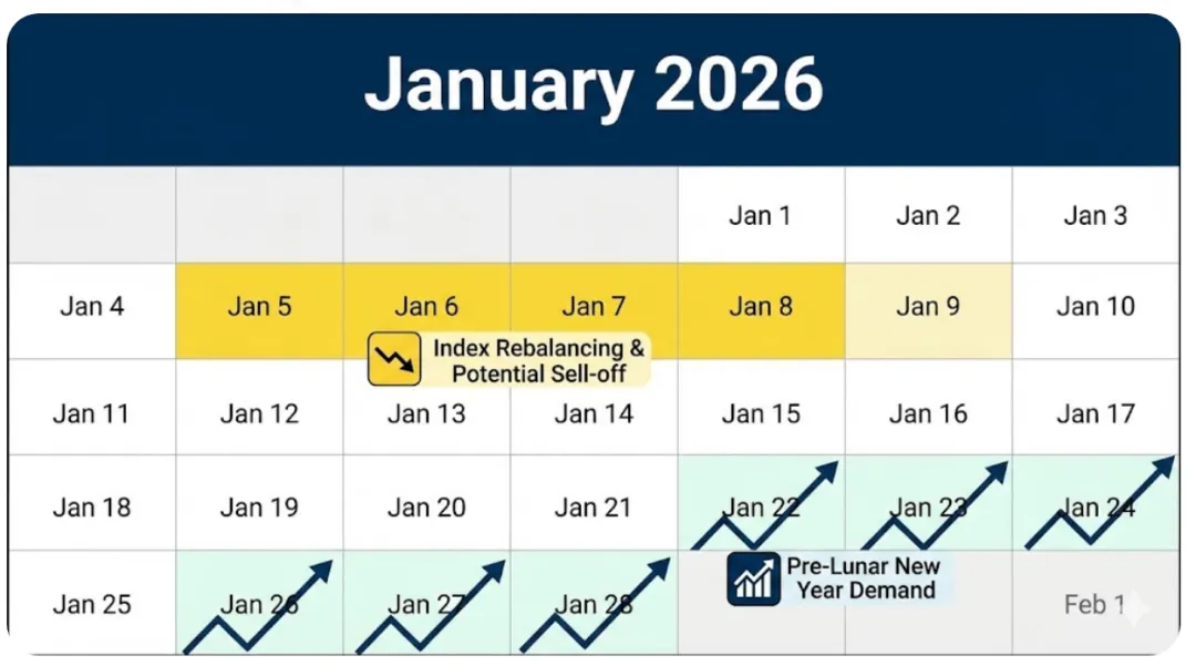 回到老大哥黄金。尽管金价在年底经历了过山车般的回撤,瑞银明确表示:没有理由改变核心看涨观点为什么继续看涨?核心逻辑依然是“配置不足”。无论是机构、散户还是官方部门(央行),瑞银认为市场参与者的黄金仓位依然有提升空间 。来自亚洲的实物需求和ETF资金流入,正在不断从伦敦和苏黎世等流动性中心“抽走”金条开年“减速带”:通常在每年的第5到第9个交易日(1月初),指数再平衡(Index rebalancing)会带来一波黄金和白银的抛压 。这是一次短期的逆风,但也可能是捡筹码的机会春节效应2026年的农历新年在2月中旬,比往年稍晚。这意味着在1月到2月初,来自中国的实物备货需求将为金价提供基本面支撑波动性的双刃剑:近期的高波动可能会吓退一部分寻求稳健避险的投资者。如果价格上涨缺乏清晰的驱动力,反而可能是牛市见顶的信号,这一点需要保持警惕04|写在最后:2026年交易策略