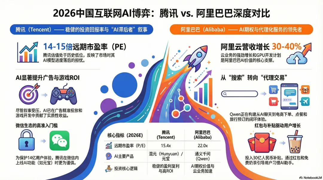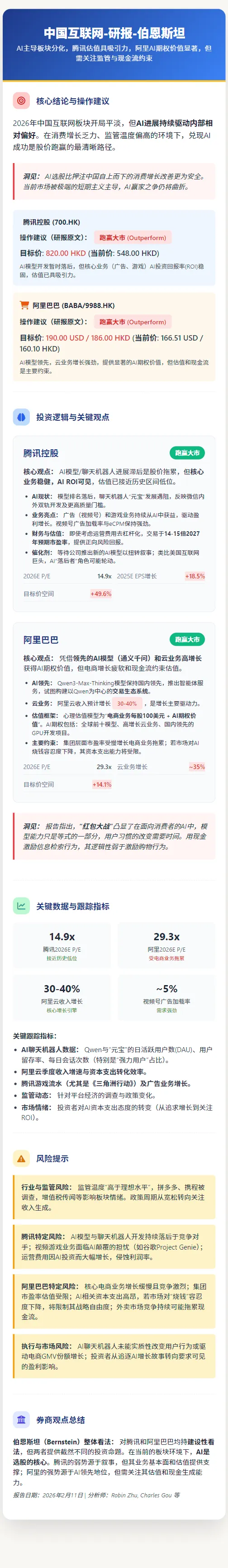 伯恩斯坦研报-深度拆解AI时代,腾讯与阿里的新战场2026年开年,中国互联网板块表现平淡,但AI叙事依然主导着投资者的偏好。一篇来自顶级投行伯恩斯坦(Bernstein)的最新报告,将镜头聚焦在两位主角身上:腾讯与阿里巴巴。报告揭示了一个清晰的岔路口:两家公司正走向截然不同的AI道路,而市场的天平,似乎正在发生倾斜。