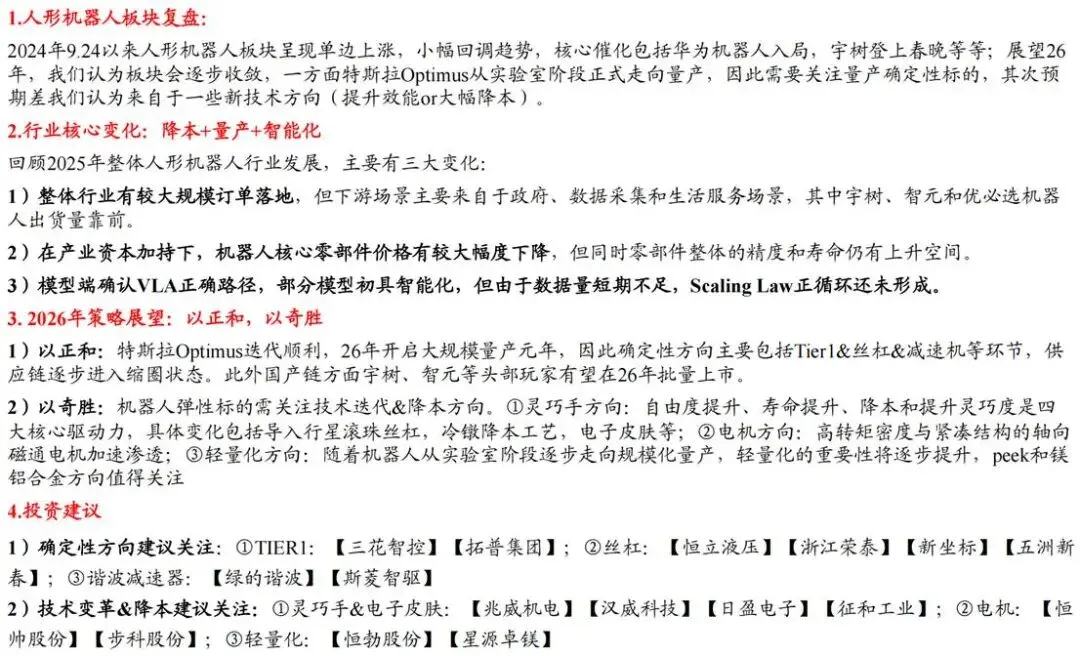分量产确定性和技术变革 / 降本两大主线,明确各细分领域核心关注标的,同时补充了减速器、下游应用等其他链条标的: