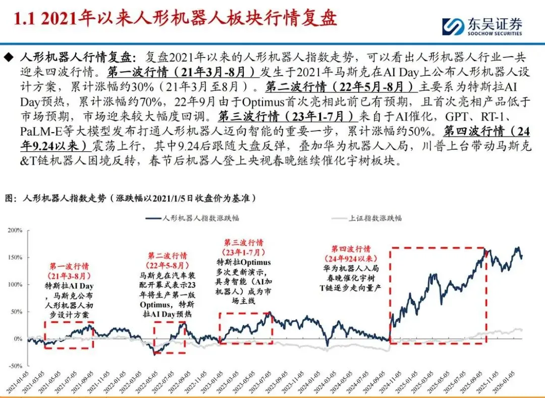 ▲2021 年以来四波核心行情:均由特斯拉相关动作、AI 技术突破、头部企业入局等催化,累计涨幅分别约 30%、70%、50%,第四波自 2024 年 9.24 起震荡上行,华为入局、宇树登春晚、特斯拉 Optimus 量产预期为核心推手。