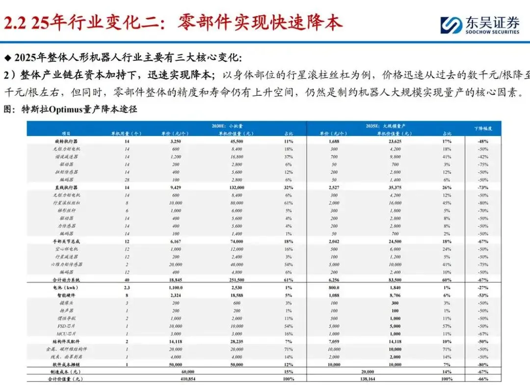 核心零部件快速降本:产业资本加持下,行星滚柱丝杠等零部件价格大幅下降(如数千元 / 根降至千元级),但精度和寿命仍是量产核心制约因素。