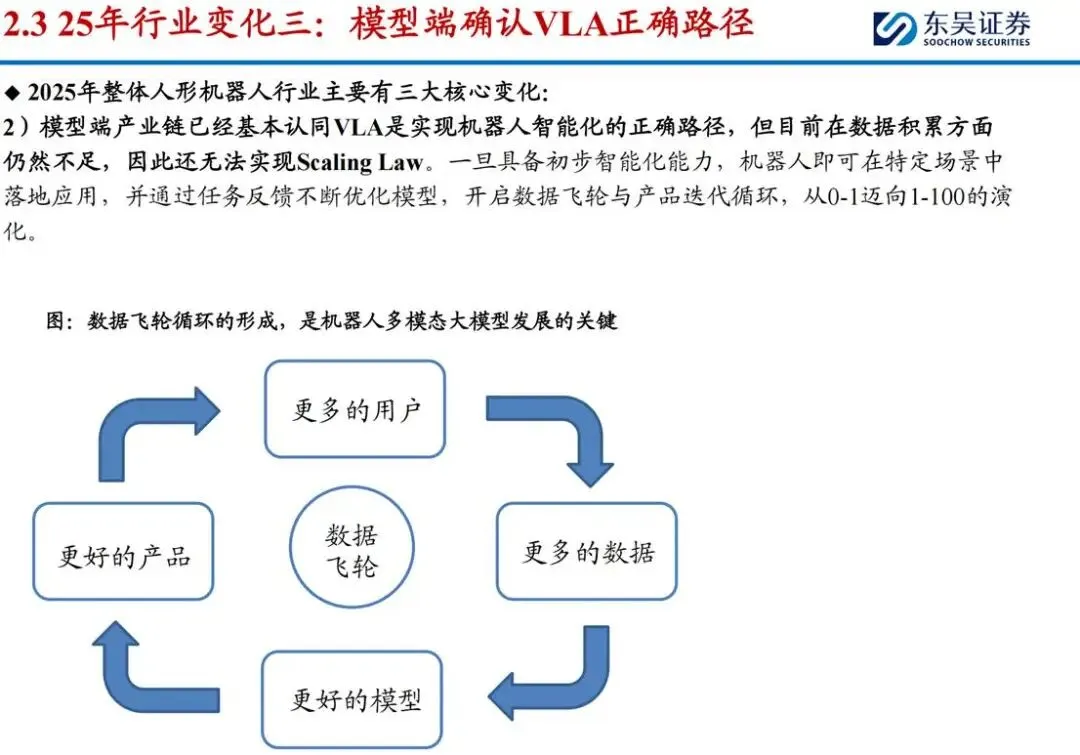 智能化明确发展路径但存瓶颈:模型端行业共识 VLA 为智能化正确路径,但数据积累不足未形成 Scaling Law;且模型端发展短期不影响量产,远程遥操将成为中期机器人落地的重要手段。