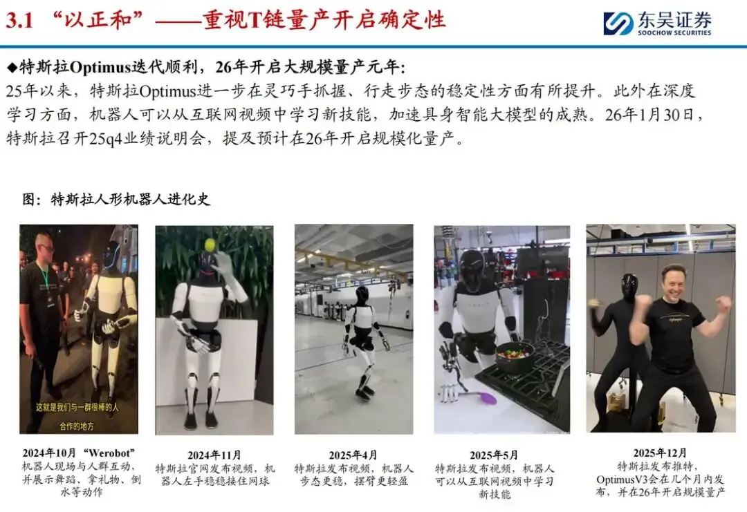 特斯拉 Optimus 迭代顺利,2026年正式开启大规模量产,其供应链淘汰赛进入末期,Tier1、丝杠、谐波减速器为核心确定性环节,供应格局 2026 年将明晰。