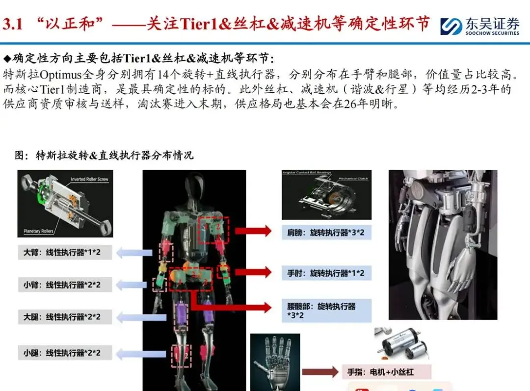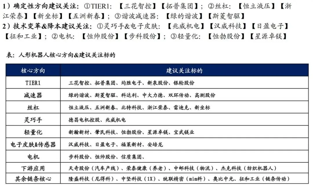 确定性方向:Tier1(三花智控、拓普集团);丝杠(恒立液压、浙江荣泰、新坐标、五洲新春);谐波减速器(绿的谐波、斯菱智驱)。